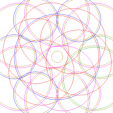 | Copy circle 7 another five times, to the centers of circles 5 and 6. |