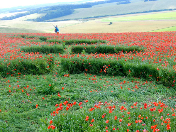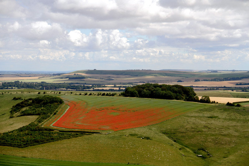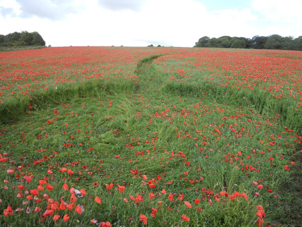 The crop is linseed (flax) with a heavy dose of poppies, especially in the lower parts of the field.