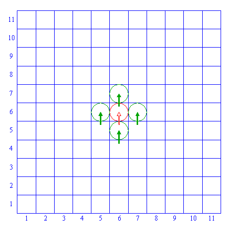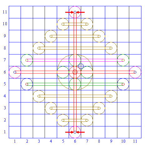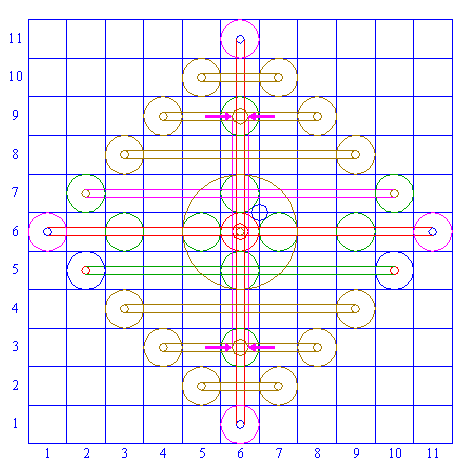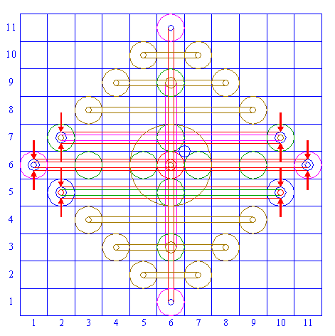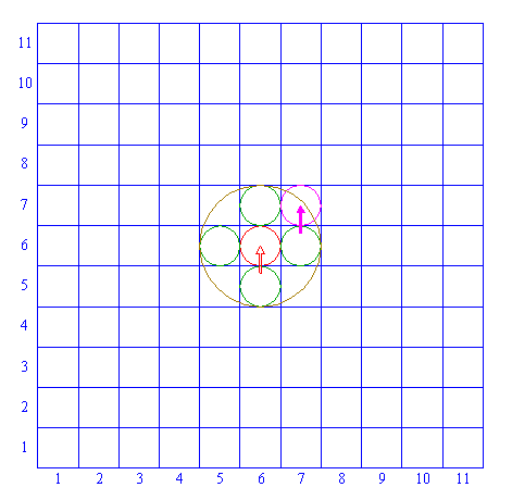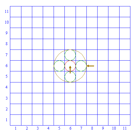 | Copy circle 2 four times, to the centers of the horizontally and vertically adjacent squares ((5,6), (7,6), (6,5), (6,7)). |