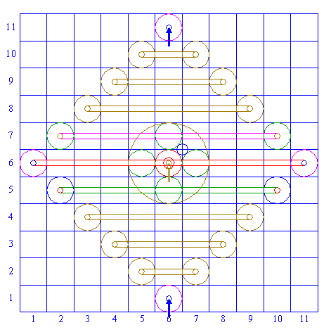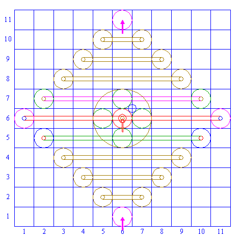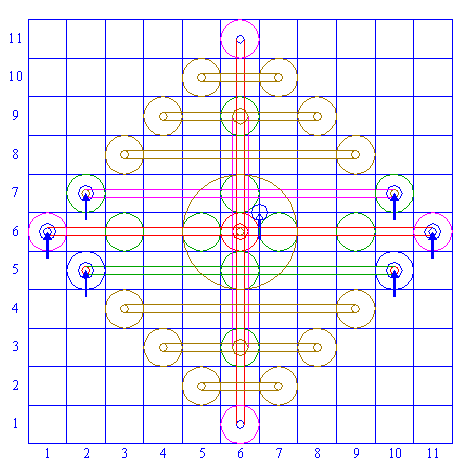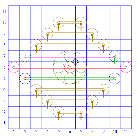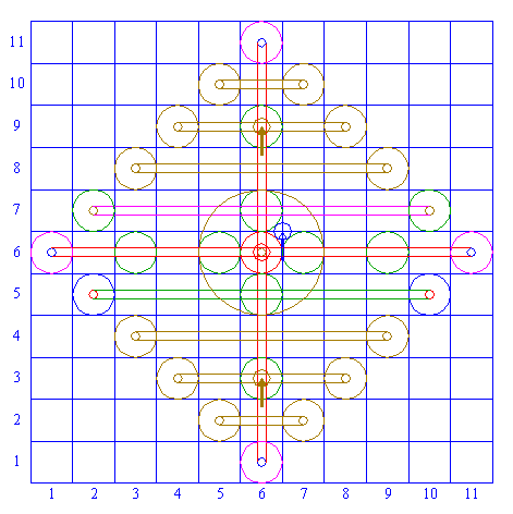 | Repeat steps 10, 11 and 12 another six times, for respectively squares (3,8) and (9,8), (4,9) and (8,9), (5,10) and (7,10), (3,4) and (9,4), (4,3) and (8,3), (5,2) and (7,2). |