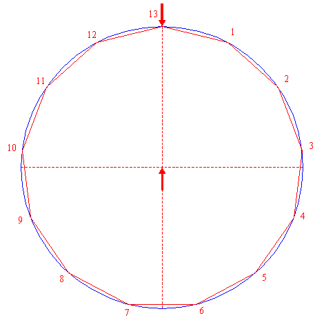 | Construct the inscribed regular 13-sided polygon of circle 1, pointing up. Number the angular points 1 - 13 clockwise, starting at the one next to the top to the right.