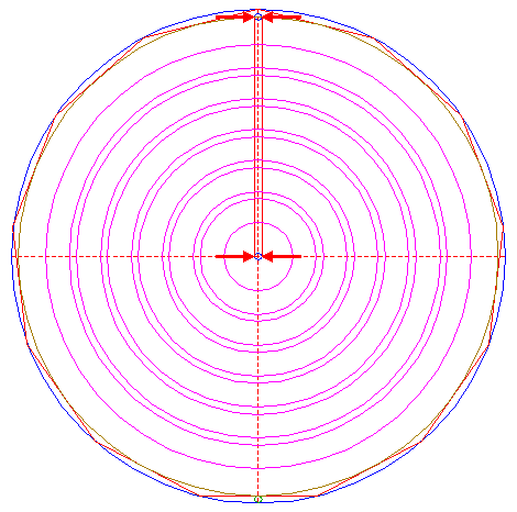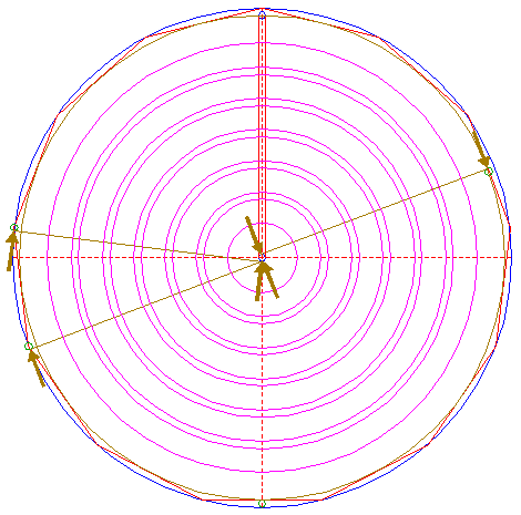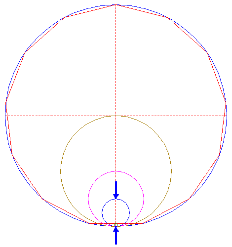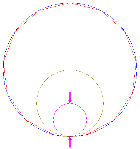 | Construct a "two-points" circle (defined by the two end-points of a centerline) between the lower intersection of circle 1 and the intersection of the lower side of polygon 2, with the vertical centerline.