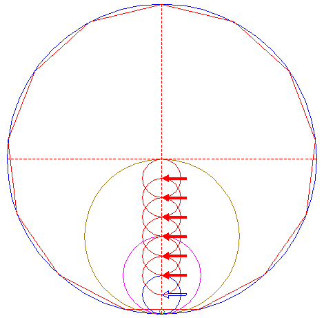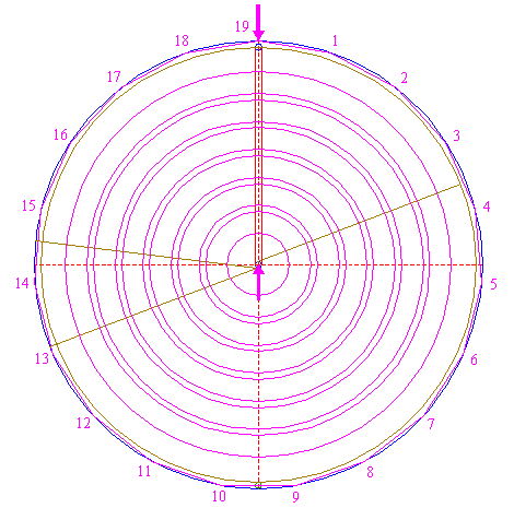 | Construct the inscribed regular 19-sided polygon of circle 1, pointing up. Number the angular points 1 - 19 clockwise, starting at the one next to the top to the right.