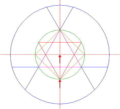 | Construct the inscribed equilateral triangle of circle 1, pointing up. |