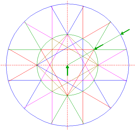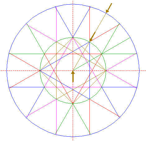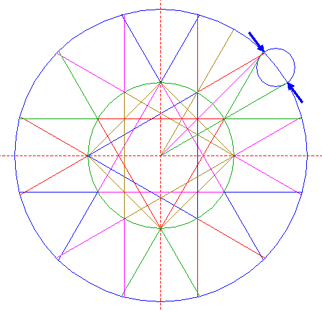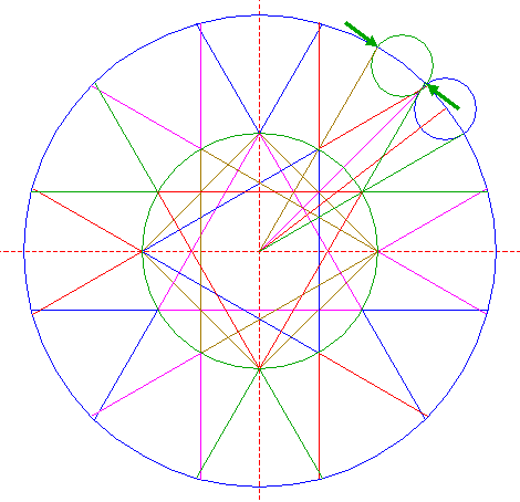 | Construct a "two-points" circle (defined by the two end-points of a centerline) between the intersections of lines 13 and 15 with circle 1. |