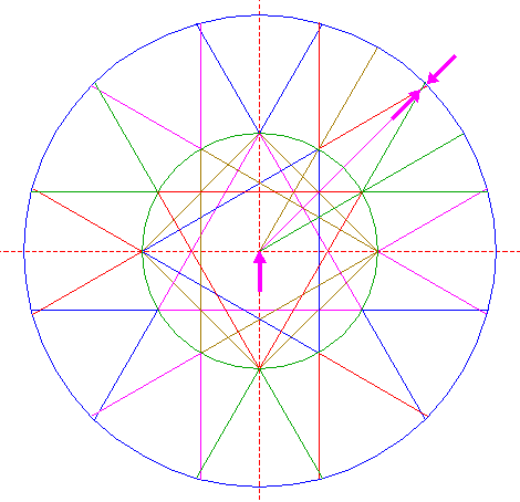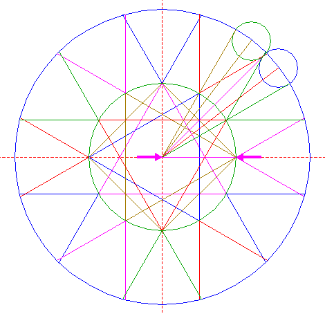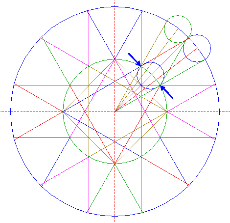 | Construct a "two-points" circle between the intersections of lines 14 and 15 with circle 1. |