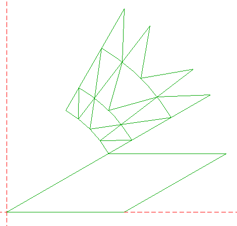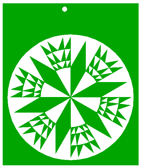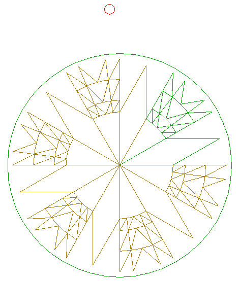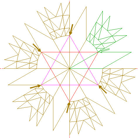 | Copy pattern 33 five times (repeat all the necessary steps), taking the upper righthand angular point of triangle 7 as a reference point, to the (other) angular points of triangles 5 and 7, while rotating around the center of circle 1 by 60° consecutively. |