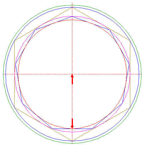 | Construct the circumscribed dodecagon (regular 12-sided polygon) of circle 1, with the mid-point of one side on the horizontal centerline (to the right). |