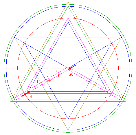 | Repeat steps 22, 23 and 24 two times, with respect to the other two sides of triangle 16, each rotated over 120° about the center of circle 1, as shown. |