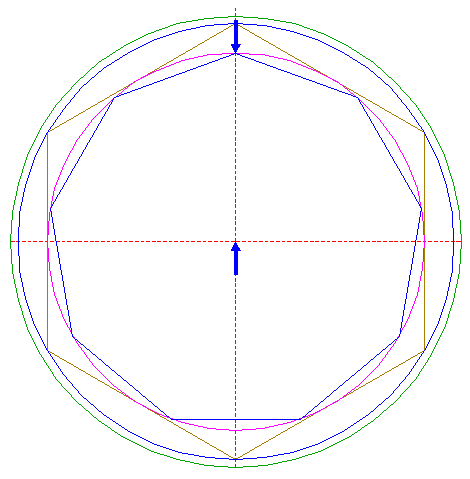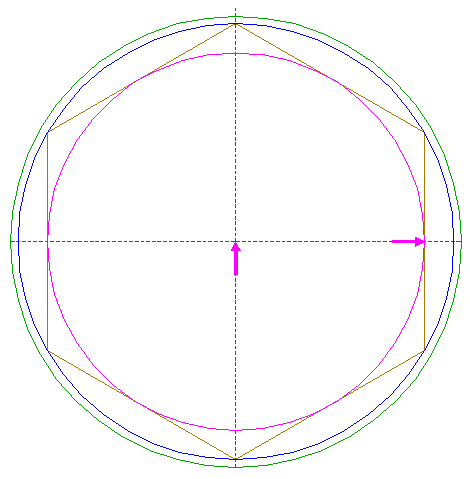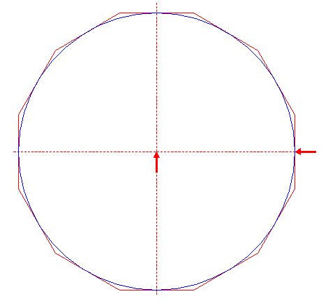 | Construct the circumscribed dodecagon (regular 12-sided polygon) of circle 1, with the mid-point of one side on the horizontal centerline (to the right). |