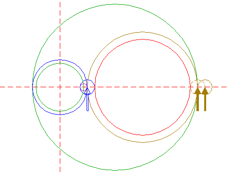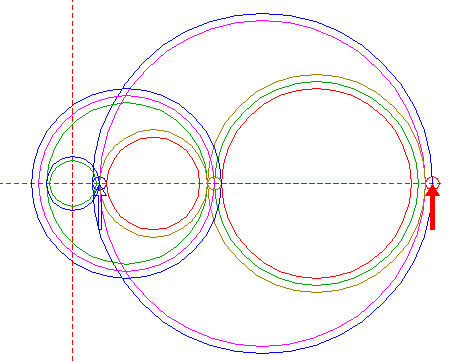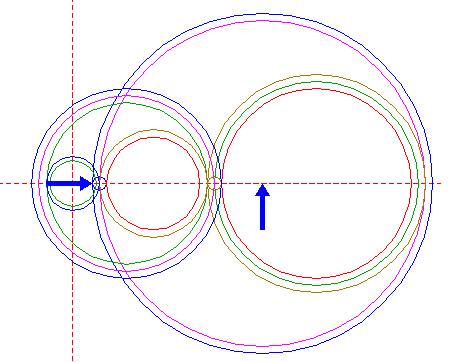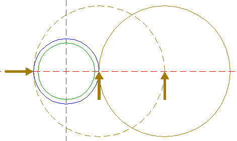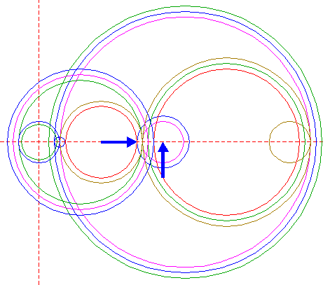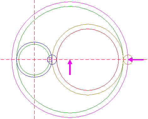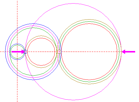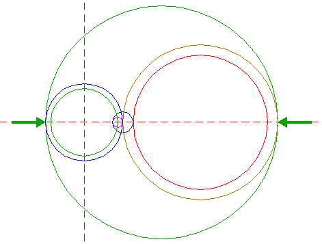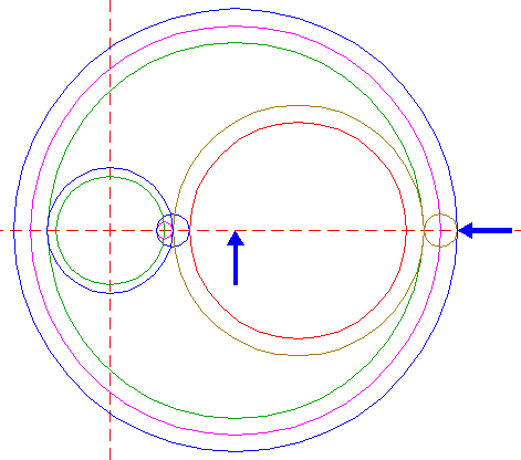 | Construct a circle centered at the righthand intersection of circle 1 and the horizontal centerline, tangent to circle 1 at the lefthand side. Move this circle (copy and delete original) to its own righthand intersection with the horizontal centerline. |