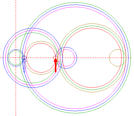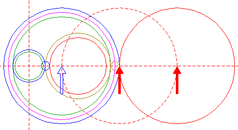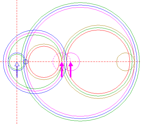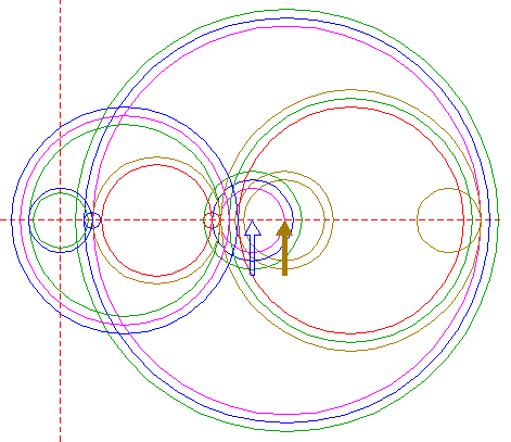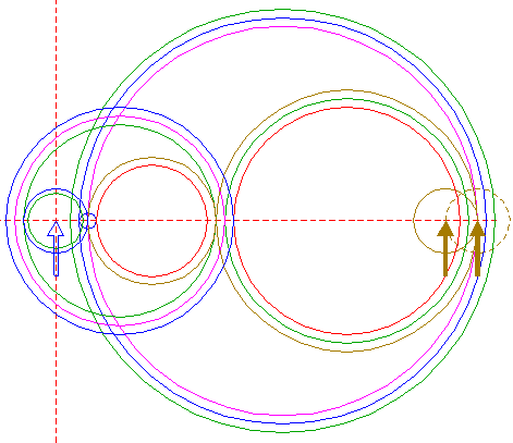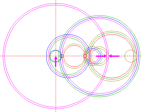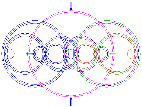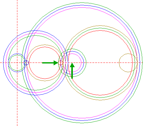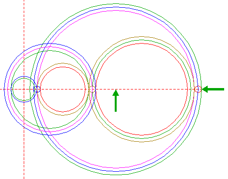 | Copy circle 1 to the righthand intersection of circle 14, and move this circle to its own lefthand intersection, both with the horizontal centerline. |