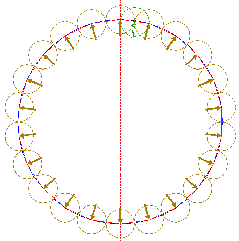 | Construct the inscribed regular 34-sided polygon of outer circle 25, pointing to the right. |