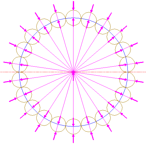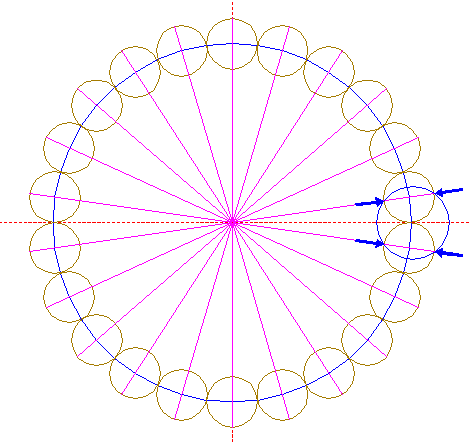 | Draw twenty-two rays, from the center of circle 1 to the centers of circles 4, and extend these lines up to their outer sides. |