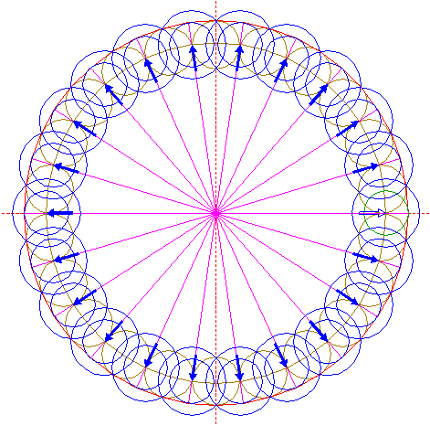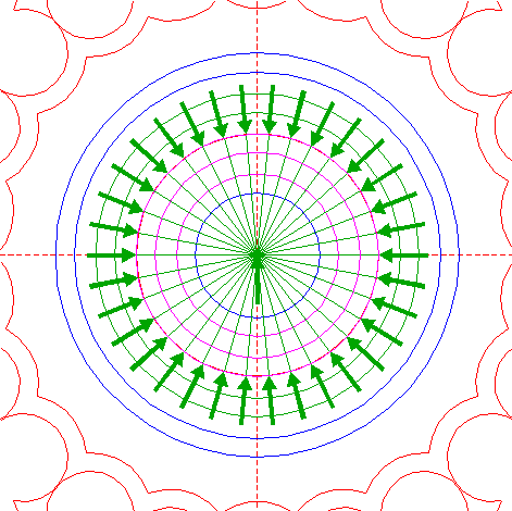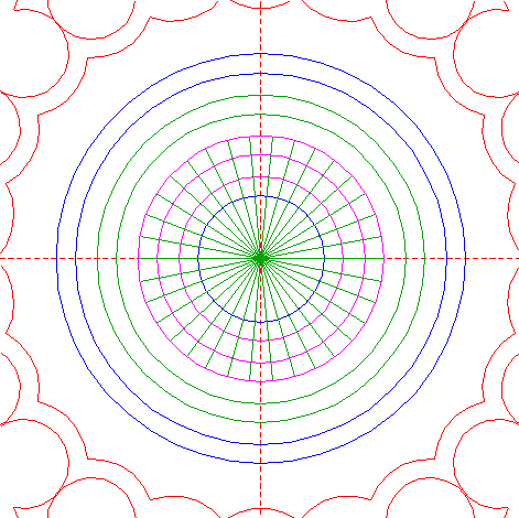 | Copy circles 6 and 8 twenty-one times, to the other intersections of circle 9 and rays 10. |
