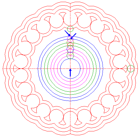 | Draw twenty-two rays, from the center of circle 1 to its intersections with circles 4, and extend these lines up to circle 7. |