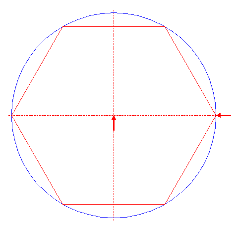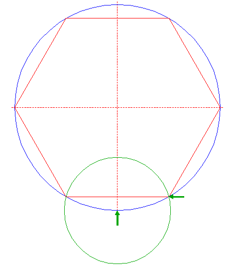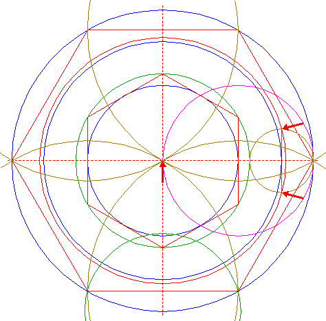 3. | ![]() | Construct a circle centered at the lower intersection of circle 1 and the vertical centerline, passing through the lower angular points of hexagon 2. |