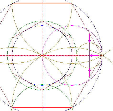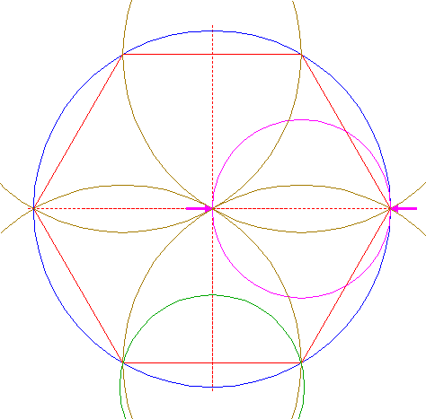 4. | ![]() | Construct four circles centered at the upper and lower angular points of hexagon 2, all passing through the center of circle 1. |