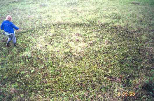 Five doughnut shaped rings, including one "half-crescent", averaging about 15 feet diameter, in pasture vegetation (wild grass, bear berry
