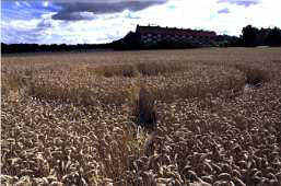Description: From ground-level, the quintuplet was impossible to see at any distance, even from the edge of the field, and was first seen from a workman's crane. Within the 25-meter broad formation, the central circle was 4.3 meters in diameter; then 2 meters away came a concentric ring ca. .7 meter thick; then 4 meters away a surrounding ring about .5 meter thick; and on this were 4 rings in the 4 directions, each less than a meter thick. There were numerous geometrical irregularities throughout the glyph. All parts were lain counter-clockwise. There was no underlying pathway to the circle's center, although the lay started there. The seedheads were stiff and parallel. There were many exiting crop-tangents from the surrounding rings, all at the same distance, angle, and thickness. The stalks were bent at ground-level.