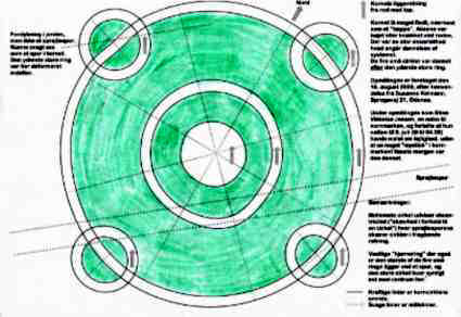 The corn lay very flat, like a carpet. The four surrounding circles were lain after the ring they lay upon. The middle circle is bent particularly near one side of the tractor-lines. Near another depressed path in the earth, the outer ring bent considerably toward the formation's center." Diagram by Esben Pedersen Most of this information comes from material collected by the Dansk Korn-Cirkel Gruppe. Photos were scanned by Bjørn Boman. |