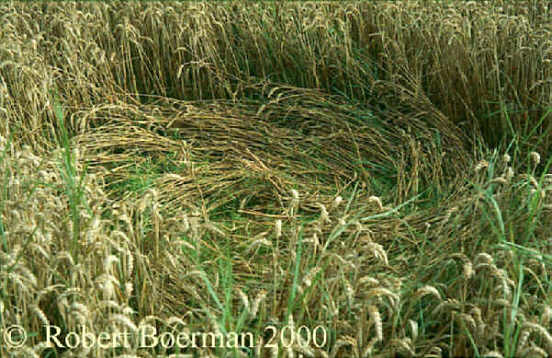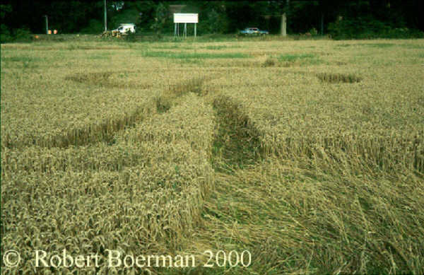 Crop circle found on 06-08-2000 on the exact same place as were I found the formation of 1997. The formation was already a week old. All the circles are anti clockwise and the paths were formed from the circles. The complete formation was about 85 meters long.