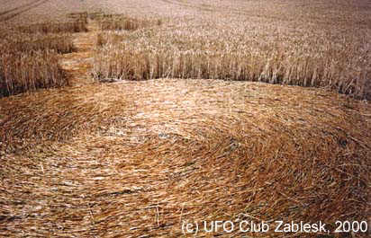 The second crop circle formation in Czech Republic for this year was reported on 5th July. It was found on 30th June in the traditional locality not far Skuhrov nad Belou. The formation consist of 3 circles, which had various diameters / (N-S) 7,4m , 3,7m, 7,1m / and 2 lanes in wheat. There are many artificial new circles in the line, which where made by people. They are big qualitative differences between old and artificial circles . We investigated : radioactivity, high-frequently- radiation, contents of minerals in soil. All the dates were in the norm. We took samples of wheat corn for a laboratory. The research was performed by Jan Cerny and Jakub Hottmar (UFO Club Zablesk)