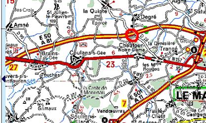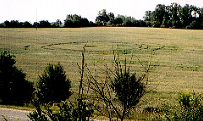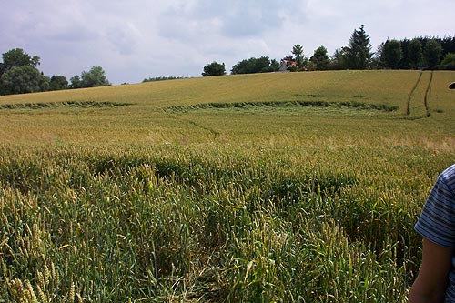 I just received this report of a crop circle in France. This crop circle formation in a wheat field was spotted for the first time by Crop Circle News member "pcocfr56" at very high speed on the Highway on the 29th of May 2003, then a second time on the 2nd of June when he was able to pinpoint it's approximate location. A third time on the same road on June the 11th he was able to stop and take a picture. The picture was taken from the emergency stop part of the highway, strictly forbidden except if your car is broken down, which is why the the photo is a little blurred, while driving from west to east (RENNES to LEMANS).
