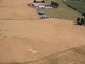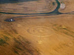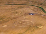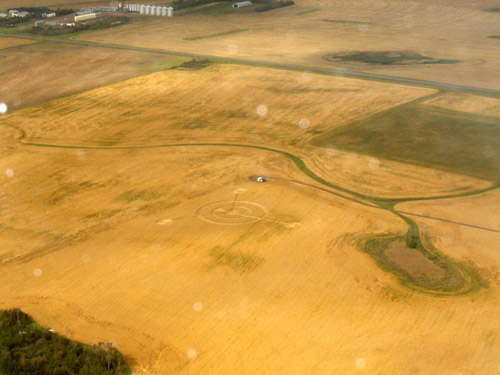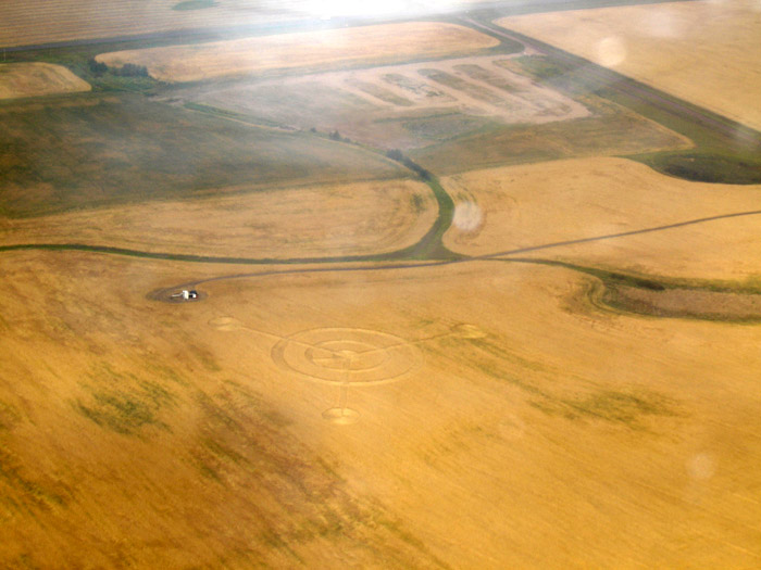 UPDATE Just heard this morning from Judy Arndt (CCCRN Alberta / Crop Circle Quest) of a new formation near Provost, Alberta, found about September 1. The location is very close to the Saskatchewan border. Double-ringed circle with three straight arms coming out from the centre, ending in smaller circles. I've attached four initial aerial photos (two originals and two cropped enhancements by Judy). The "bols" in the original photos in this case, I think, are just dust or moisture on the plane window. Further details pending. Click on Thumbnails to enlarge