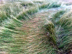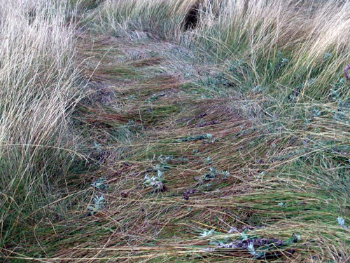 The lateral sideways lay of the grass (including in small "bunches") can