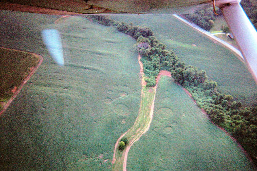 Description: 5 circles total: 3 approx. 50' in diameter. abutting each other, 2 smaller circles (approx. 25' diameter.) on either side of centre circle. All circles swirled clockwise. The farmer (photo above) reports that neither he nor the Sheriff found any trail into circles on Aug. l9th when field was first examined and no evidence could be found of human involvement. He also reports that the plants were flattened (not broken) in 90-degree angles at the base and states that he doesn't think people made these circles. He adds that the plants are not dead and that, because of the height of leaf recovery back up toward the sun, it is his impression that the circles have not been there any longer than one week. The farmer does not have farm animals or dogs, but he has observed no unusual EM activity, no unusual smells or light phenomena during the last week. He was unaware that similar circles were found in a soybean field in Belleville, Illinois very recently.