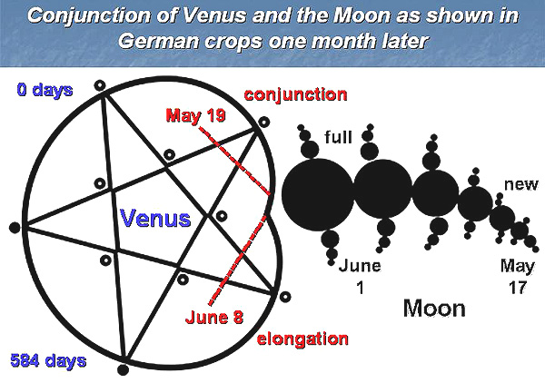 A conjunction of Venus with the Moon (as shown in Germany) was used to date lunar cycle I from East Field A new crop picture appeared in Germany on July 1, 2007, that was apparently intended to help us interpret a somewhat more complex crop picture from East Field on July 7. That German crop picture showed in its lower part a "five pointed star", which is the traditional symbol for planet Venus, and in its upper part a series of "lunar phase symbols" similar to those shown at Stonehenge in July 1996: