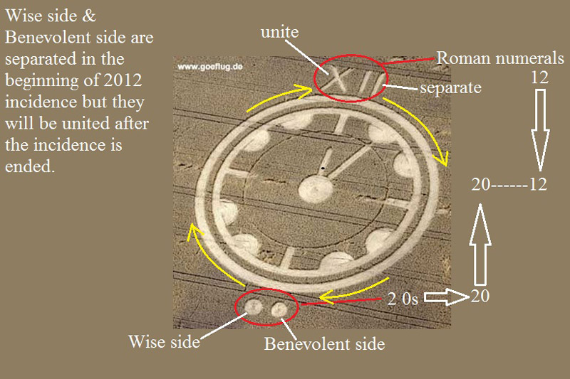 The crop circle represents a clock-face. The clock hand shows 5 past 12 o'clock. The crop circle consists of 2 circles which form a frame for the clock-face, the clock-face with 8 semi cycles, 4 paths and a thin circle and in the centre is a circle with a small and a big clock hand. Outside of the formation above the 12 on the clock-face there is a roman number "XII" = 12. On the other side of the roman number, outside of the formation, are 2 small circles next to each other. The crop lies down in the clockwise direction. The crop circle located in Groß Schneen also consisted of 2 small circles outside the formation.