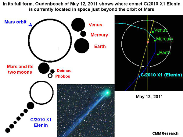 astronomy of comet C/2010 X1 (Elenin), showing: (a) where it is