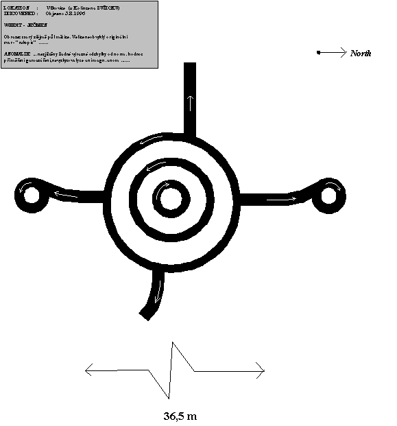 This curious pictogram was found at Vlckovice near Kolinec ( a famous crop circle site ), West Bohemia, on August the 6th. Sadly, the field had already been harvested. Nevertheless, we still managed to detect signs suggesting that the formation might have been genuine. It was 37 m in diameter and resembled a target or something of that kind.