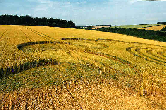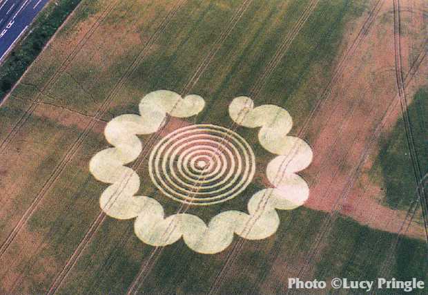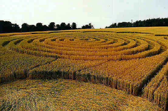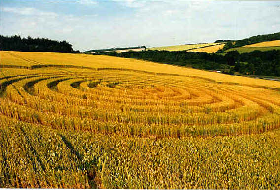 This report is dated 13-07-1995 and was submitted by Stuart Dike In my opinion, this formation is one of the best of this year. The central part is made up of seven concentric rings around a small circle in the middle. Surrounding the rings is a beautiful half-moon design. It is similar to the "Astrograms" near Winchester. The half-moon shapes flow into each other making a necklace, which does not quite connect to make an entire ring. The lay is extremely impressive, with many standing stems visible, and it has the feeling of water flowing around the necklace. The atmosphere inside the formation was as restful as a church as it was quite a contrast to the rushing traffic on the A34. The central rings were all flowing clockwise including the middle circle. The location was not really suitable for this formation,because of the angle it was placed in the field, and the fact that you could not really take a decent shot from the road.The best location to view it is from the bridge that crosses the A34. The formation can be seen before the turning off the A34 heading North. |
