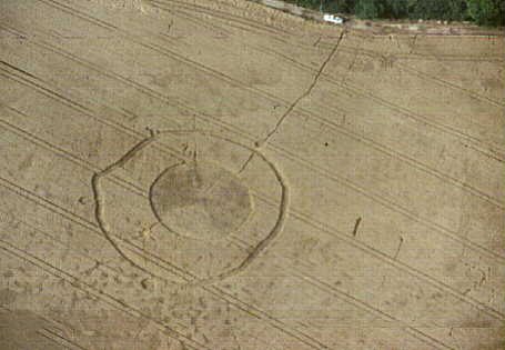 Around the outside is a really rough ring with bits coming off at various points. Also around the outside of the ring are four small circles, each about 10 feet in diameter. The formation is arranged in a Celtic cross design. The diameter of the ring is 155 feet and the crop is wheat. It is reckon the formation is a week old.