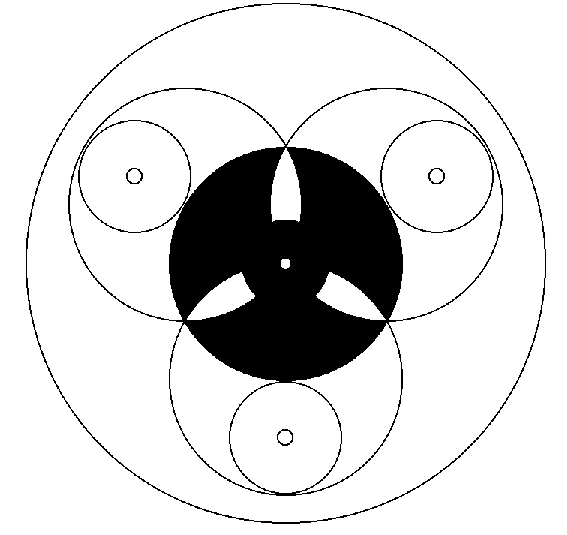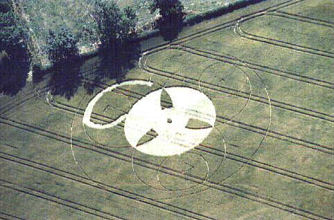 This formation is on the left hand side of the A32 coming from Alton, after the first sign posted direction to West Tisted. Unfortunately I was unable to enter the circle as an entrance to the field was not apparent and I was unable to locate a farmer/farmhouse. However I was able to observe the following. The crop appears to be wheat and consists of a main centre circle approximately 40-50ft in diameter. In the centre circle crop remains upright at the centre point and 3 'leaf' shapes at 120 degrees from each other, which appear to have been created from the intersections of 3 other circles which appear to be of identical size. Inside the 3 outlined circles are 3 smaller outlines which intersect with the circumference of the main circle and the outer outlined circles. Inside the smallest circles are marks which could not be determined from my position. Outlining the entire formation is a further circle approx. 100ft in diameter.