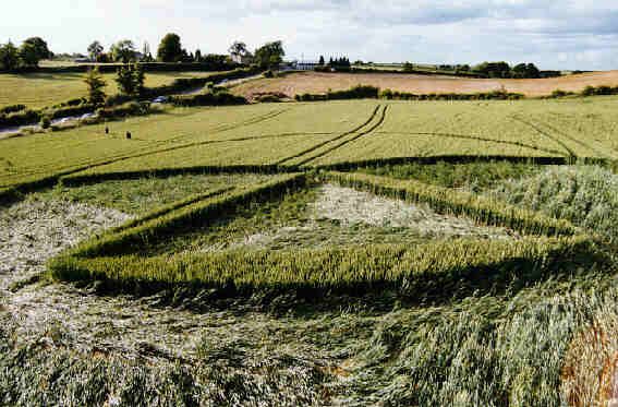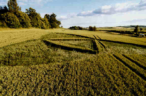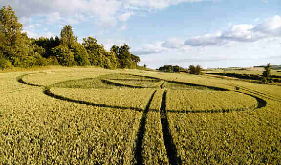 FIELD REPORT This design was the third event to occur very close to were both Mark and myself live. This particular area, is the Duchy of Cornwall land, and is owned by a number of Farmers who live in the local area. The location of this design came as a great surprise to us, as it was positioned very close to the main road leading from Corston to Marksbury. It was tucked up in the corner of the field, along the boundary of Stantonbury Hill Fort, placed on the gentle slopes leading up to what is now a wooded hill. Its quite dramatic to view this formation from the road, which consist of three circumscribed circles, interlocking, with a central section containing a triangular design, within a flattened area of crop. Inside the central Triangle the crop is laid in three portions, which is mirrored on the outer section of crop, but this time split into two different directions. The quality of the floor construction was pretty good; however, there was a feeling of compression on the stems, and a mechanical feel to the way the crop was flattened. This type of detail is worrying, I prefer to have crop, which has a fluidity to its construction. Our time as short within this formation, but it was a welcomed edition to other designs in the area. Report by Stuart Dike. |