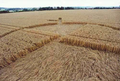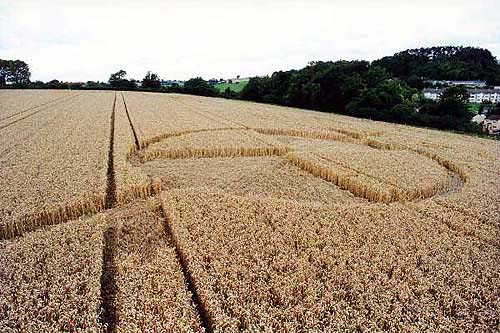 Positioned very close to the field boundary, this design was meant to be seen from the top road leading to Radstock. Its set within a valley, in green wheat and consists of a circle with four quartered sections inside. Two are raised, and two are completely flattened. Coming off on either side of the circle, seem to be fork appendages almost identical to each other. The pattern itself, appears to be quite fresh, it probably formed earlier this week around Monday or Tuesday 13th. Reported by Stuart Dike