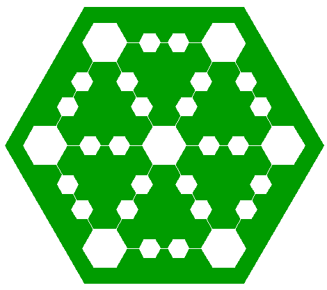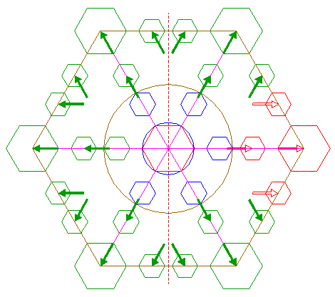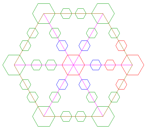 | Copy the set of hexagons 17 five times, and divide the sets over the other angular points of hexagon 14 in a similar way, along the other rays 15 (six in total), as shown. |