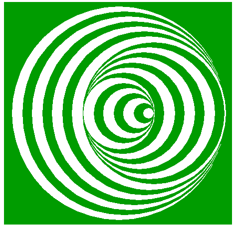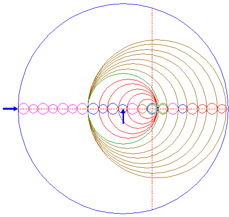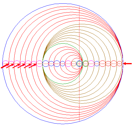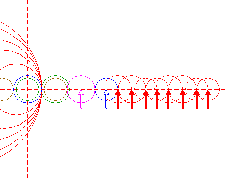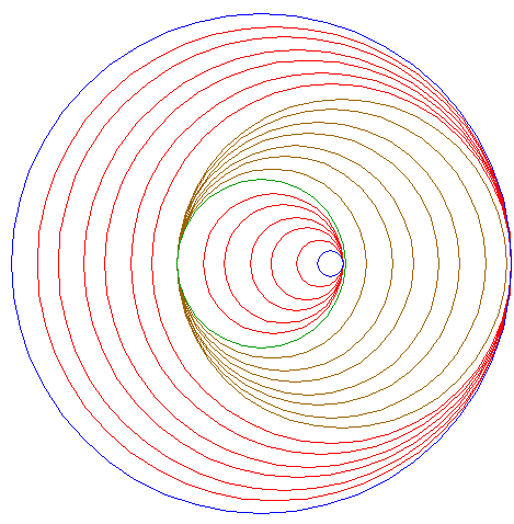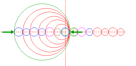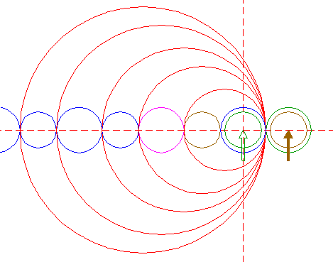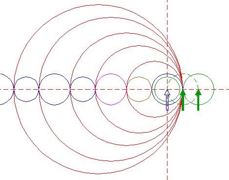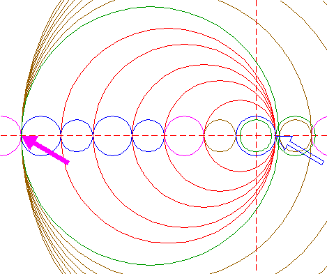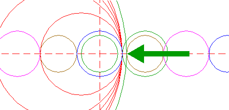| Construct five circles, all centered on the horizontal centerline, all tangent to circle 1 at the righthand side, and tangent to circle 5 and successive circles 6 at the righthand sides.