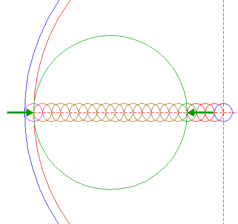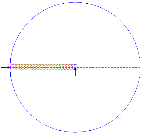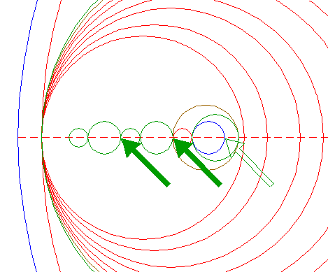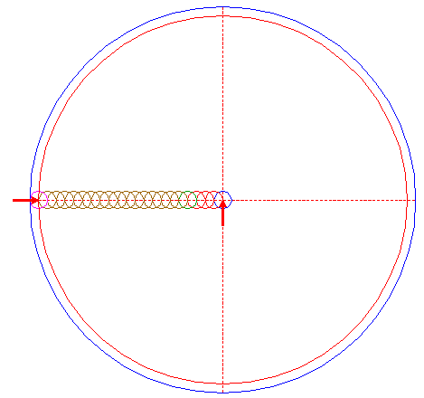 | Construct a two-points circle, the first point at the lefthand intersection of circle 18, the second point at the righthand intersection of circle 20, both with the horizontal centerline. |