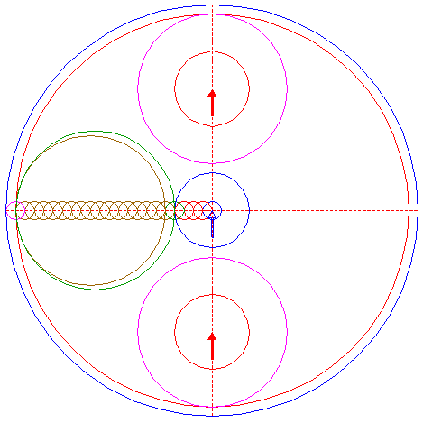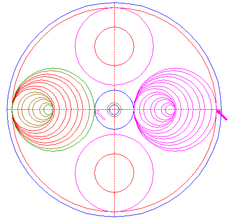 | Construct six two-points circles, all with one point at the lefthand intersection of circle 8 and the horizontal centerline, the other points at the centers of all copied circles 16. |