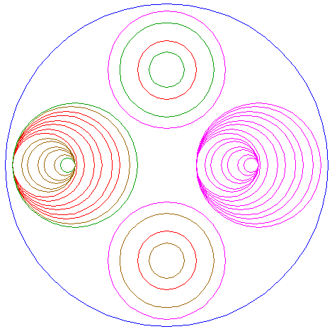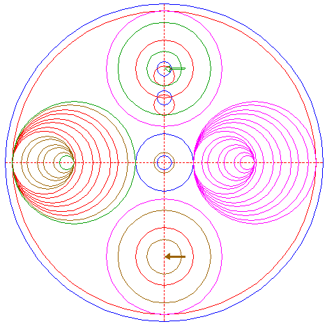 | Copy circle 1 sixteen times, to the lefthand intersection of circle 3 and the horizontal centerline, and to the corresponding intersections of successively copied circles, as shown. |