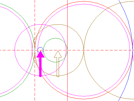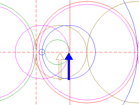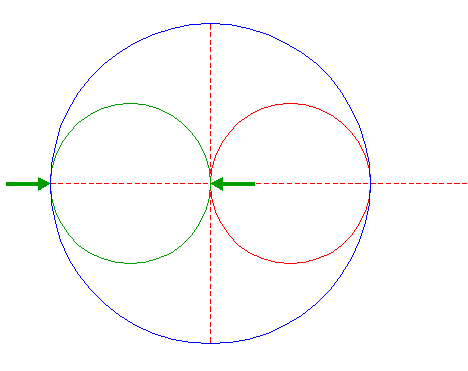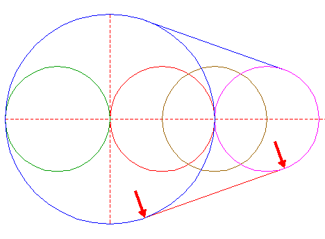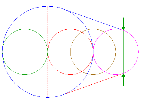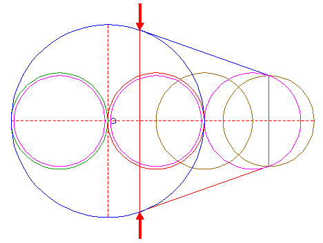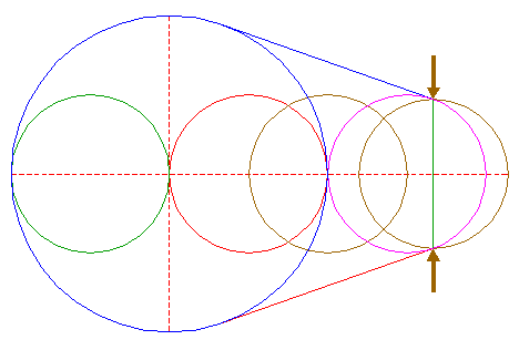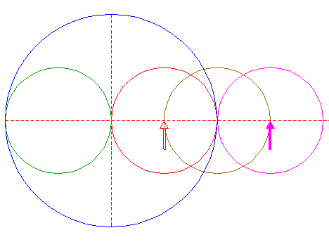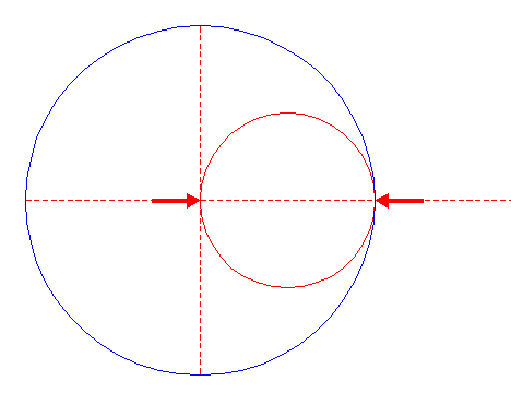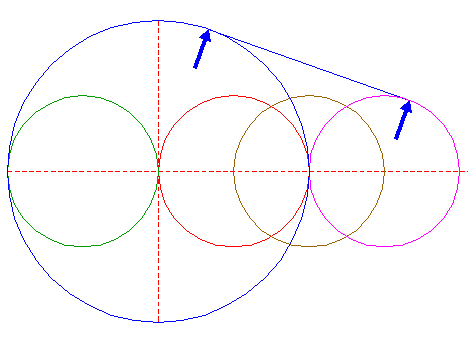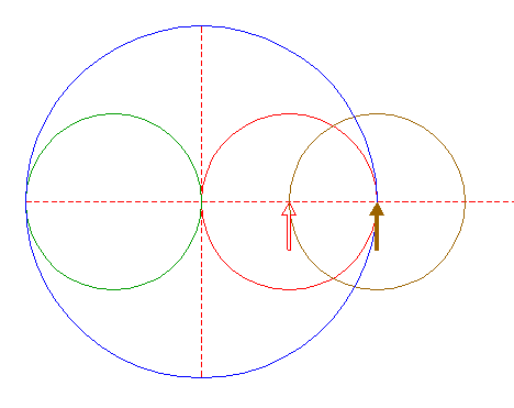 | Construct a circle, the endpoints of the centerline of which coincide with the center of circle 1 and the righthand intersection of circle 1 and the horizontal centerline. |
