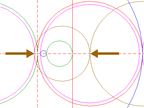 | Construct a (small) circle centered at the lefthand intersection of righthand circle 10 and the horizontal centerline, passing through the center of circle 1, and move it (copy and delete original) to its righthand intersection with the horizontal centerline. |