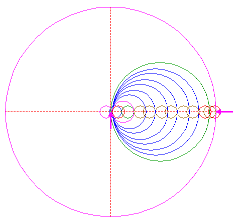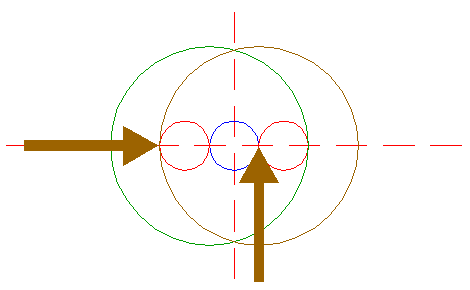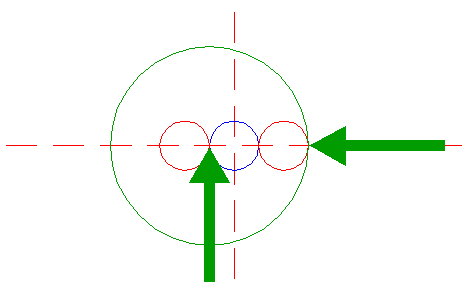 | A circle is fully defined by the two end-points of a centerline; in the following steps, such a circle will be called a 2-points circle, with references to both points. Construct a 2-points circle, with one point at the righthand intersection of circle 1, the other point at the righthand intersection of circle 8, both with the horizontal centerline. |