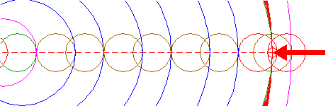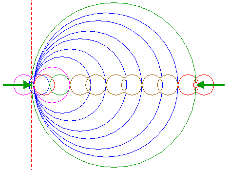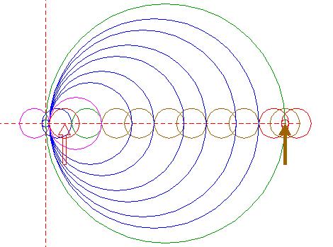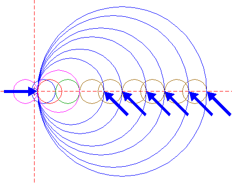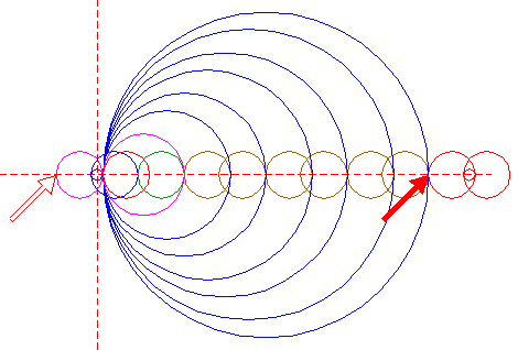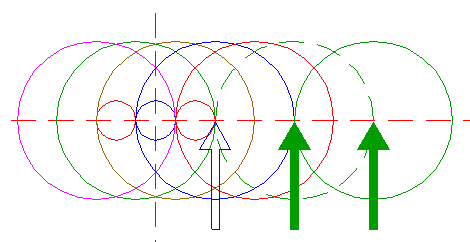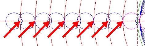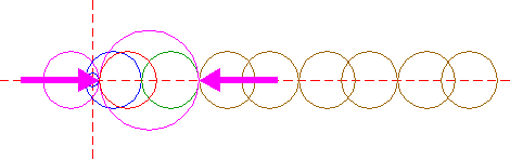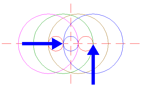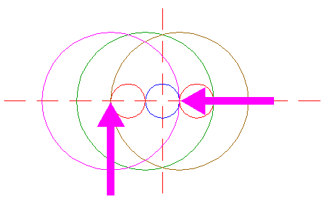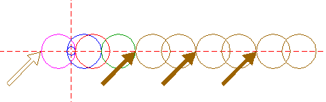 | Copy circles 5 and 6 as one unit three times, taking the lefthand intersection of circle 5 and the horizontal centerline as a reference-point, consecutively to the rightmost intersections with the horizontal centerline (the first of circle 8, the second and third of the newly copied sets), as shown. |
