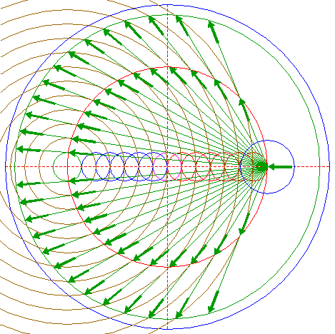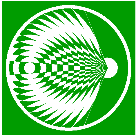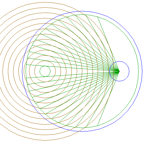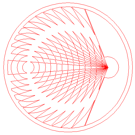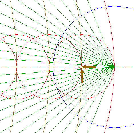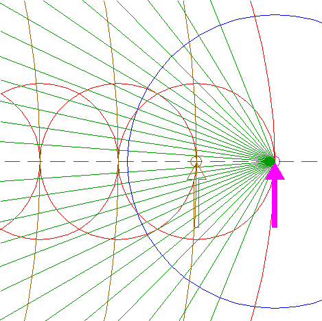 | Draw 26 connecting lines, all from the center of circle 11, to the successive intersections of circle 12 with circles 8 and 9. Extend all these lines up to circle 3, as shown. |